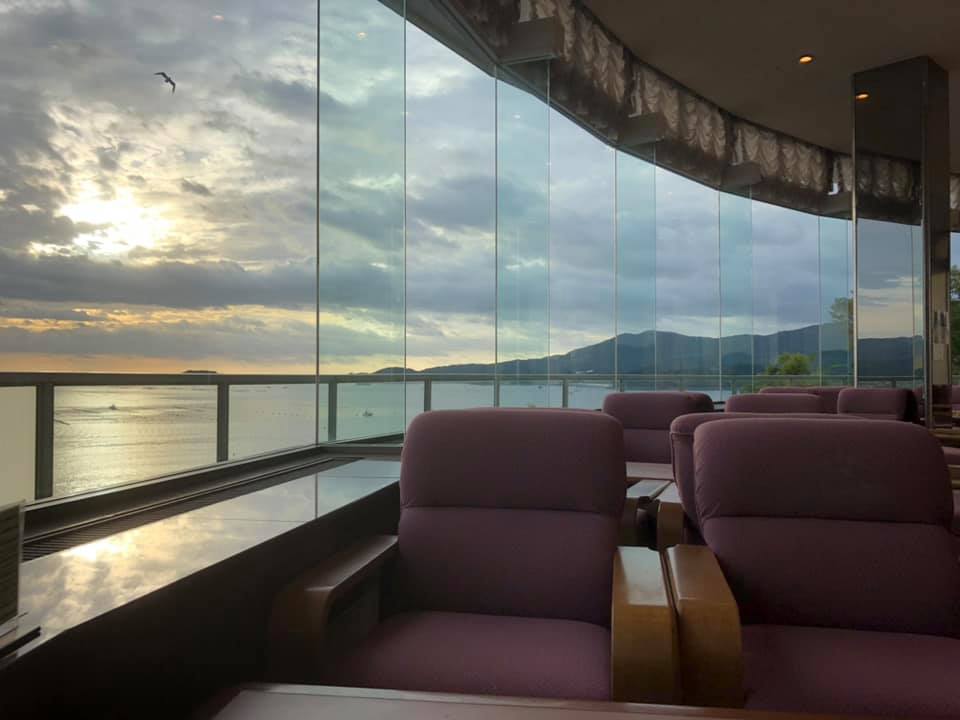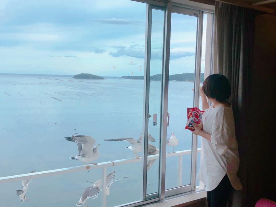 このホテルの客室からはウミネコが餌をねだる窓の向こうに広大な海が望めます。